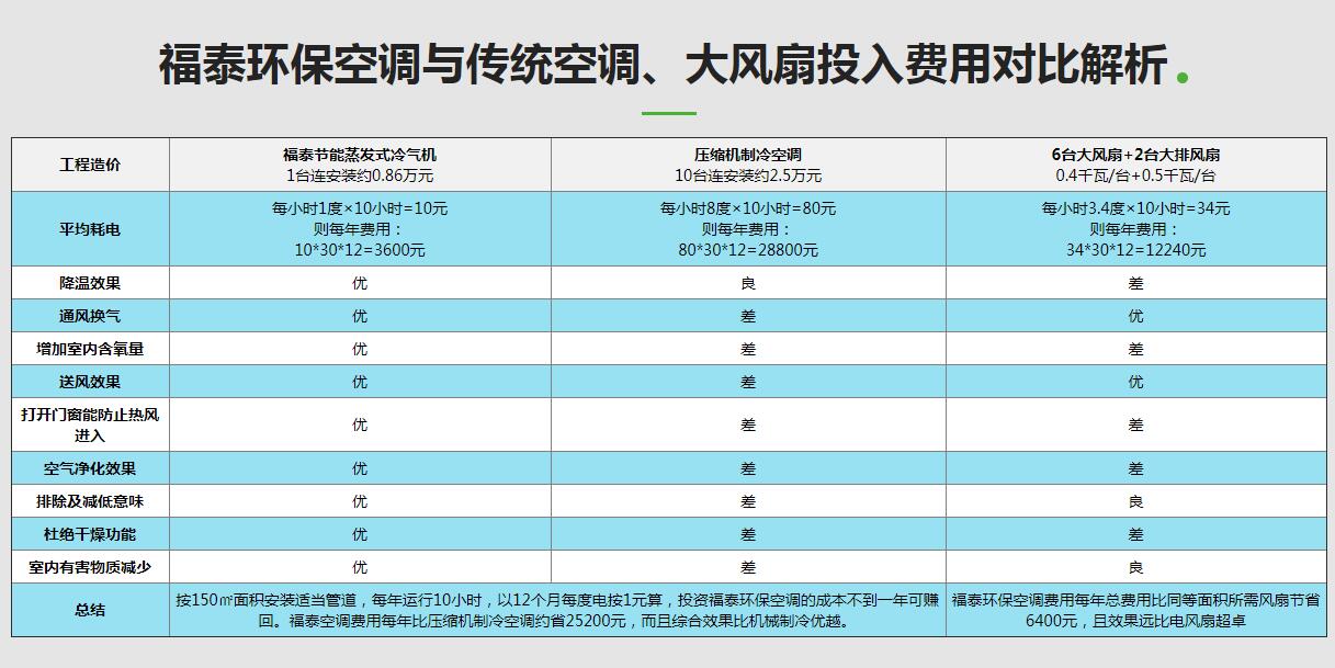 實際的降溫實際效果與安裝環(huán)保空調的方案設計是有著非常大的關系的,設計方案工業(yè)廠房降溫務必要明白如何計算車間內的換氣次數方式, 及其車間內該怎樣設置適合的環(huán)保空調的總數、輸出功率冷熱空氣的對流等,亦或是車間是需要工位降溫或者總體降溫。福泰環(huán)保空調依據“水蒸發(fā)氣化需要消耗帶走熱量”這一基本原理來降溫,戶外的汽溫越高而環(huán)保空調降溫實際效果越顯著。依據不一樣工業(yè)廠房對車間環(huán)境濕度、換汽需求、項目經費預算的不同,福泰可依據客戶實際情況定制專屬的型號規(guī)格的商品及降溫計劃方案。
