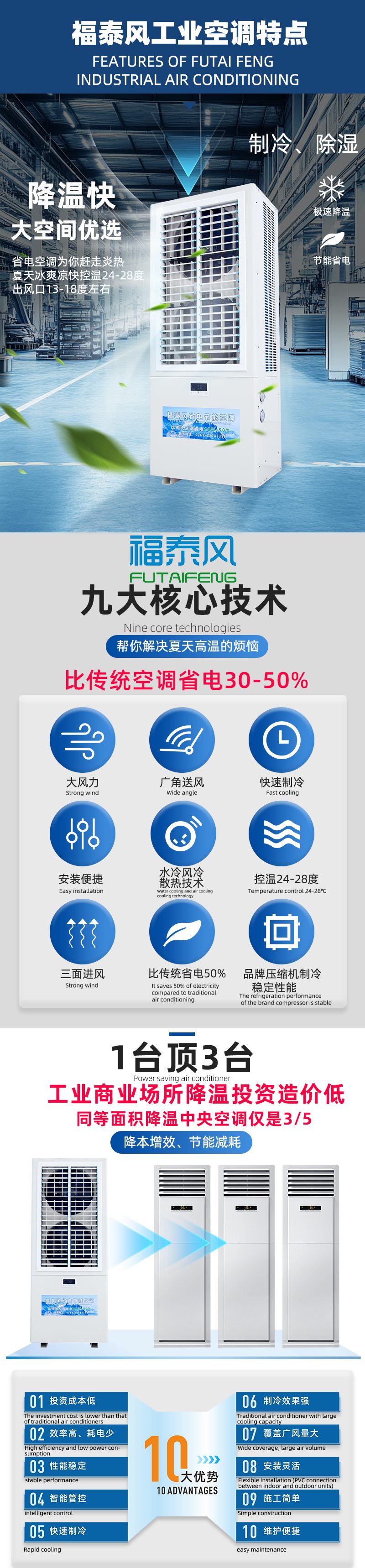 .節能省電、同等面積安裝比傳統空調省電30~50%,覆蓋面積大一臺5P的可以覆蓋200個平方車間降溫,出風口溫度可以做到13-16度。車間溫度可做到20-26度適合人體體感溫度。